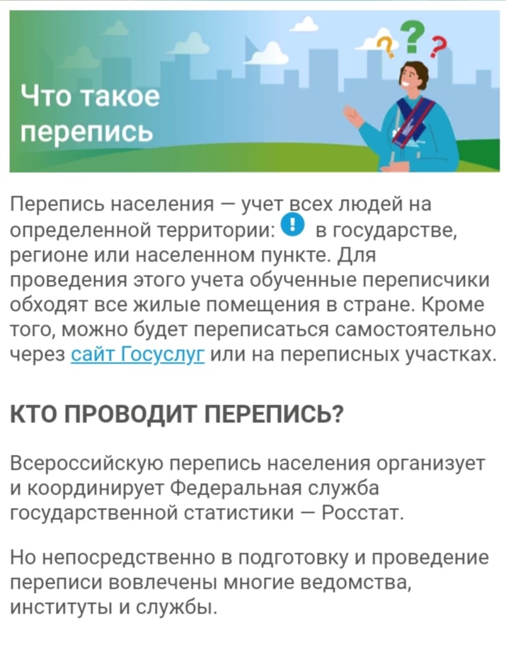 Всю информацию, связанную с проведением Всероссийской переписи населения, можно найти на официальном сайте. Там есть информация о содержании листов (бюллетеней), о требованиях к переписчикам, о сроках проведения опроса, множество других полезных данных.